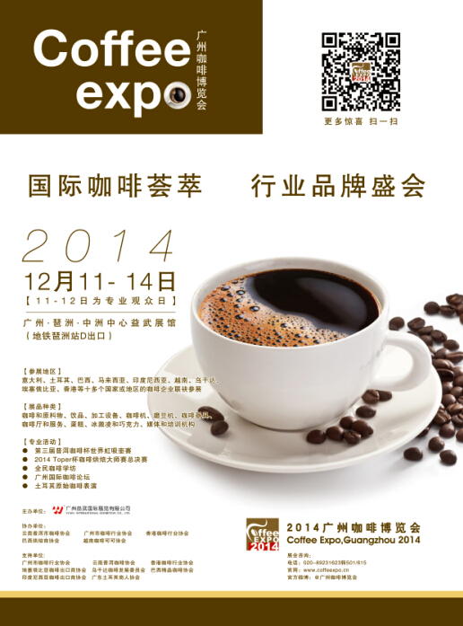 据了解,2014广州咖啡博览会将于12月11-14日,在广州•琶洲•中洲中心益武展馆举行,有埃塞俄比亚的耶加雪啡、牙买加的蓝山咖啡、巴拿马的瑰夏咖啡、印度尼西亚的猫屎咖啡、以及土耳其、巴西、哥伦比亚、马来西亚、越南、乌干达等十多个国家的精品咖啡,还有中国最好的普洱咖啡及各类咖啡饮品、加工设备、咖啡机、磨豆机、咖啡器具等。展会活动十分精彩,除第三届“普洱咖啡杯”世界虹吸壶赛外,还有2014“Toper杯”咖啡烘焙大师赛总决赛,咖啡美女拉花比赛,台北精品咖啡商业发展协会荣誉理事长陈若愚女士的讲座《如何在后制处理时增进咖啡的口感风味》等。这是一场爱咖啡人士的盛大节日。